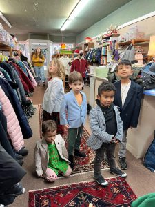 In 2024, Terry and I were in Eastend, Saskatchewan at the Wallace Stegner House Residency, wallowing in the experience of big skies,  and rolling hills, and kind residents. There were at least 3 unfinished papers I was working on.  My show, Les Grande Dames opened days after we returned, and there was some finishing work to do…mainly ‘hair.’ Artist Drew Shaffer and I worked on an ambitious collaboration the last 2 weeks before Terry and I left for Eastend. When complete The Big Skirt will stand about 62 inches tall, and is in 4 pieces.  Drew and I watched Viola Frey videos for tips……I did the main structure and the figurative elements …everything had to be force-dried to be finished in time…..I left Drew in charge of the surface treatments.  He successfully experimented with dipping old lace in porcelain slip, we made a corbel mold, and he made ‘shelves’.  Drew responded to the architectural quality of the skirt and used the ‘shelves’ to display old shards of my work found in the garden and studio…and with the help of my sister, Rosemary Sloan; my daughter, Isabel Sloan Yip; and her daughter, my granddaughter Phoebe Sloan Yip Truman – a female trifecta.  The Big Skirt – a Museum -‘I am Large, I contain Multitudes’. Here is an image in process..